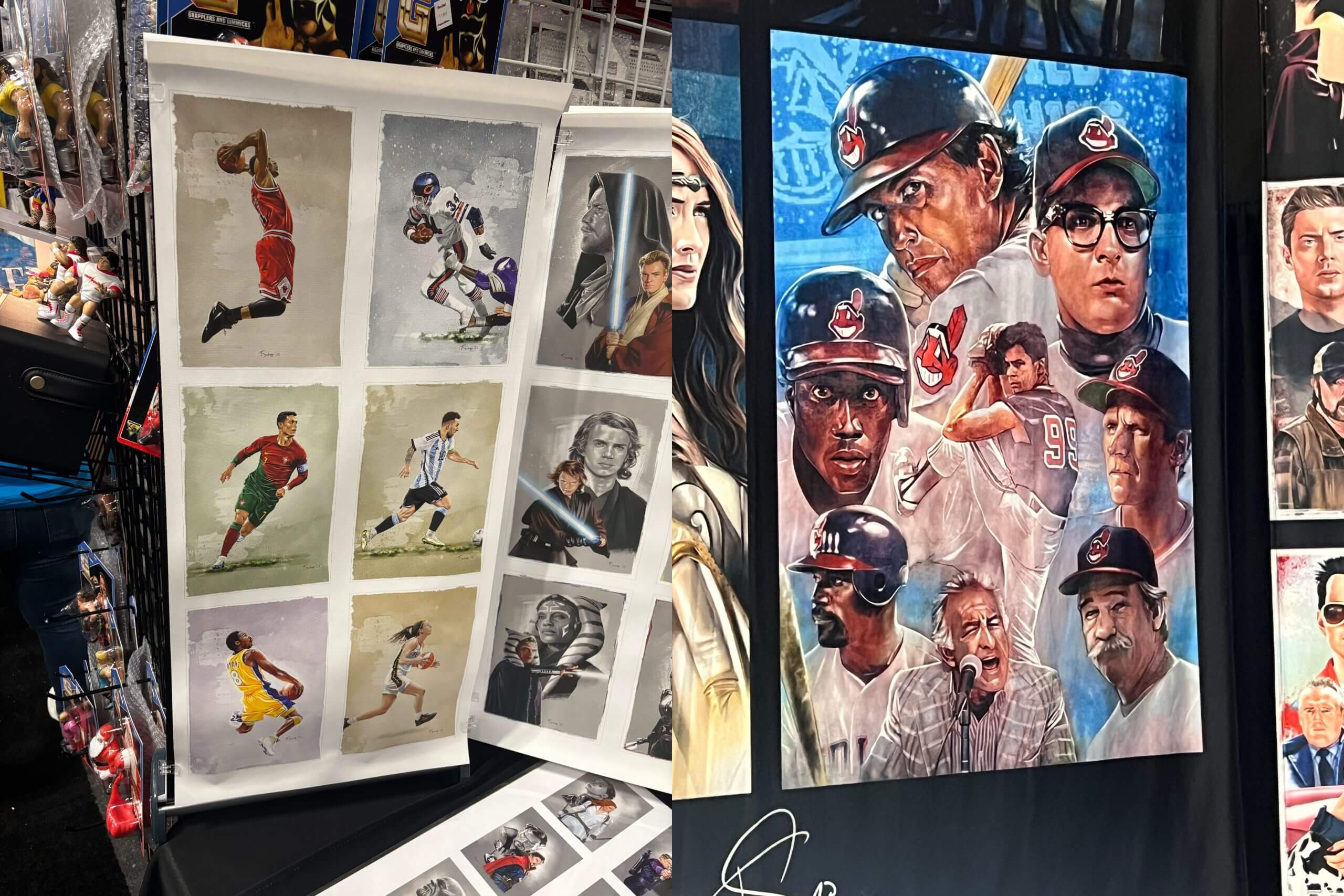 Artist Tony Santiago displayed works featuring another Chicago Bulls legend in Derrick Rose, plus Walter Payton, Cristiano Ronaldo, Lionel Messi, Kobe Bryant and Caitlin Clark, as well as the stars of “Major League.”