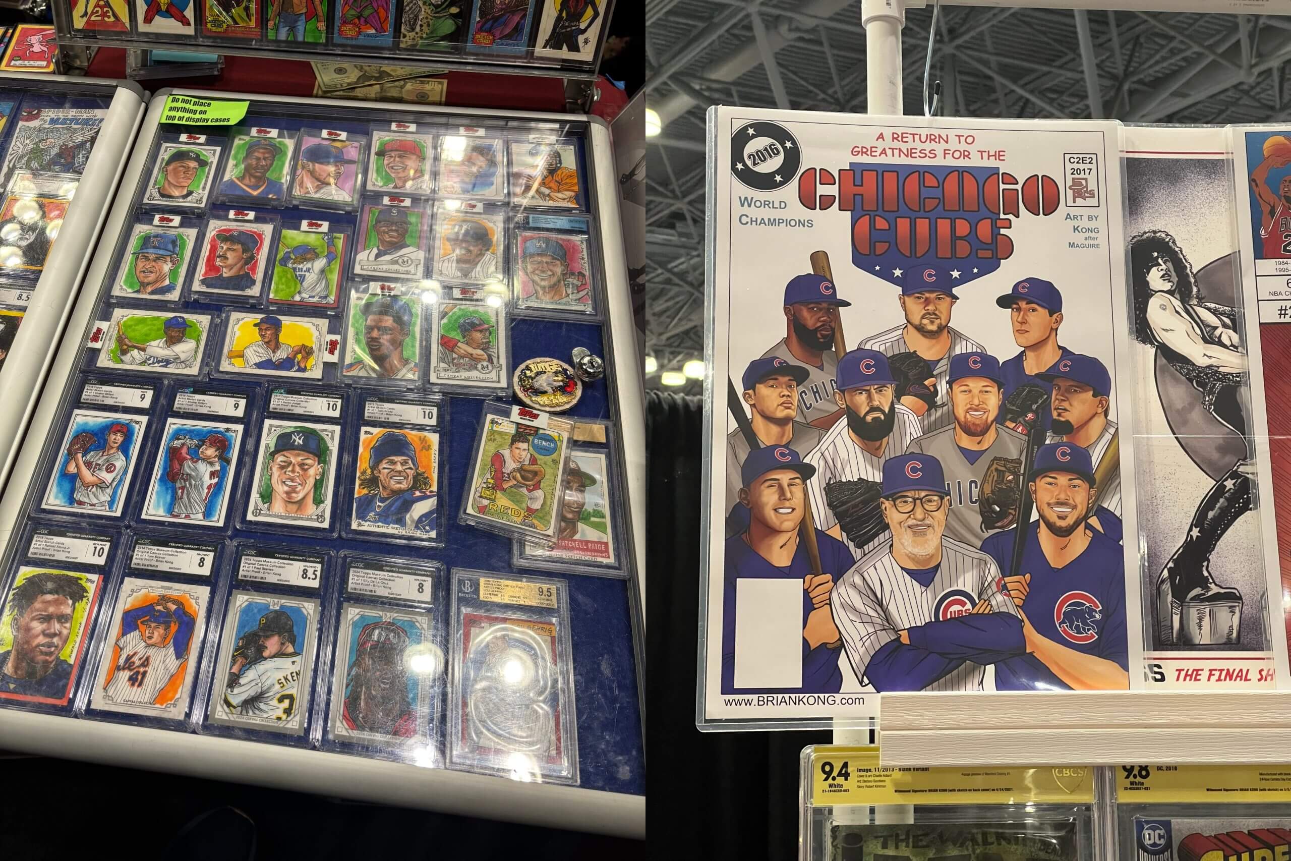 Artist Brian Kong’s booth featured his sketch cards for Topps and the 2016 Chicago Cubs replicating an iconic Justice League comic cover.