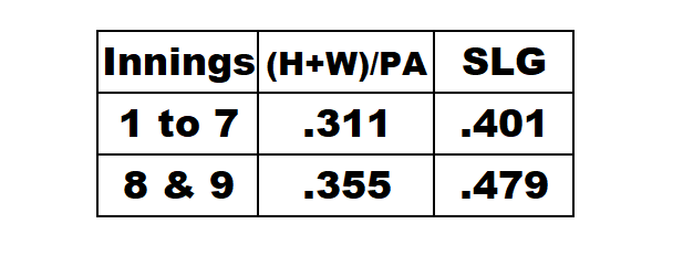 The following table (data from Baseball Savant) shows two stats that were worse in the last innings compared to the earlier innings. The differences are large enough that I’m confident that it was not due to random variation.