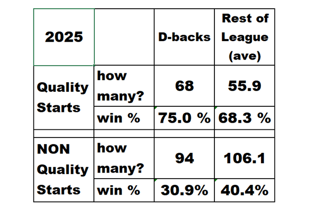 The Diamondbacks had more quality starts than league average.The Diamondbacks win percentage for quality starts was better than league average.The Diamondbacks win percentage for NON quality starts was worse than league average.