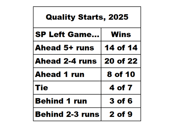 Quality starts impact the bullpen results. They give the manager more choices on picking relievers, which results in better pitcher/batter matchups.