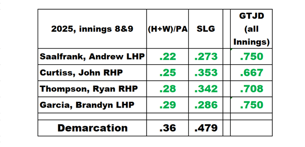 The following table (data from Baseball Savant) shows the four pitchers who show promise pitching in the late innings for next season.