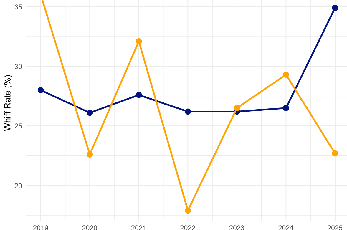 If Walker had stunk at home and on the road, we could then simply chalk up his lackluster 2025 season as being the one in which he began his precipitous aging curve decline. Take swing speed, for example. Walker, who will be 35 around Opening Day, saw his average bat speed decline from 75 mph in 2024 to 74.1 mph in 2025. His Fast Swing Rate dropped by 10.9% from one season to the next. But his Squared-Up and Blast metrics as an Astro, according to Statcast, are similar, if not better, than his numbers as a Diamondback in 2024. So, when he does connect, there isn’t much of a difference. That’s the good news. But, again, the bad news remains whether he can make contact for all of that to matter. We are talking about an aging hitter who walked less and struck out more than he has in any season in which he received regular at-bats. Even if he can still do something with the ball when he connects, it is an increasingly moot point if the rate of contact continues to fall.