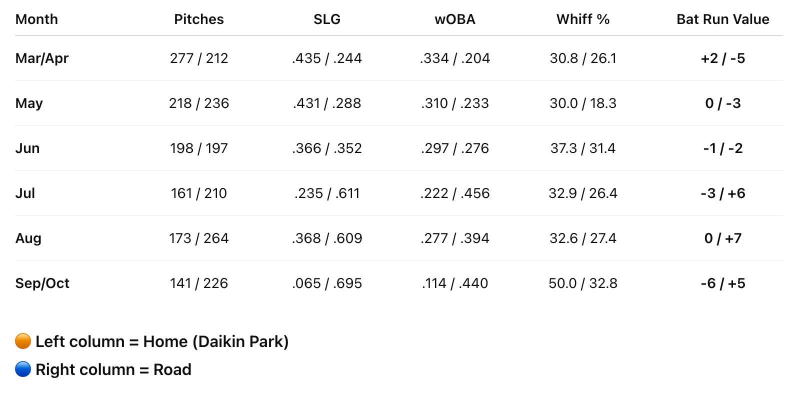 Dating back to Walker’s first season with regular at-bats in 2019, he never had a season before 2025 when he posted a home whiff rate higher than 28% at Chase Field. In his first season playing half his games in Houston, that home whiff rate climbed dramatically to 34.9%. For an older player’s whiff rate to suddenly spike approaching their mid-thirties isn’t a surprising development. A rise in whiff and strikeout rates is to be expected at this point in his career. But Walker’s road whiff rate actually declined, dropping down to only 22.7% in 2025. If we get more pitch-specific for a second — four-seam fastballs in the heart of the strike zone or in the upper region of the shadow portion of the zone — we see his away whiff rate is only 23.8%. At home, it climbs even more to 38%. That contrast on the surface at least suggests that all of his swing issues last season aren’t entirely exclusive to aging. I think it is within the realm of possibility that Walker simply isn’t seeing the ball at home as well as he does on the road. I don’t think he is the first Astros’ hitter to experience such issues, nor will he be the last.