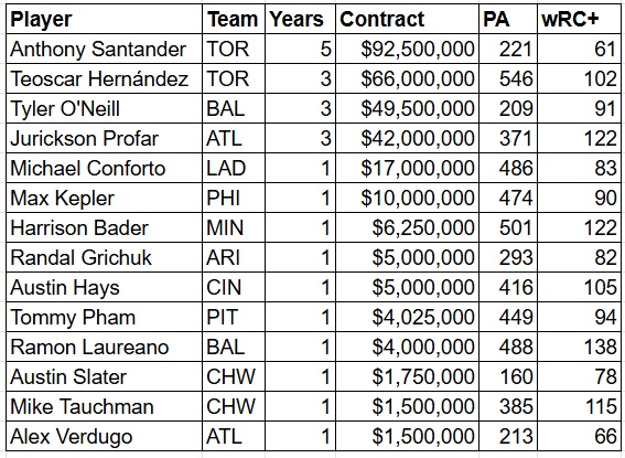 What lessons can be learned going into this offseason? The free agent market carries a significant amount of risk, particularly for expensive multi-year deals. The one-year market provides greater flexibility and seems to be a better bargain. Laureano was going into his age-30 season, Bader into his age-31 season, which put them in a good position to have a bounce-back season.
