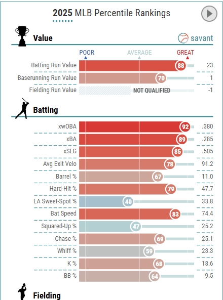 What we discover is the profile that 2024 hinted at was close but was indeed too pessimistic. A larger sample size reveals that he hits the ball harder than thought (avg exit velo) and he is a bit harder to K than it seemed.