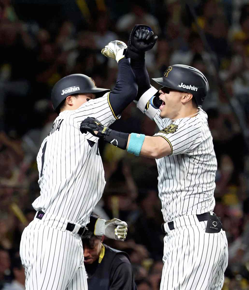 Hanshin Tigers player Teruaki Sato,right,gives a high-fives after hitting a three-run home run to take the lead, at the Hanshin Koshien Stadium in Nishinomiya, Hyogo Prefecture, on Friday.