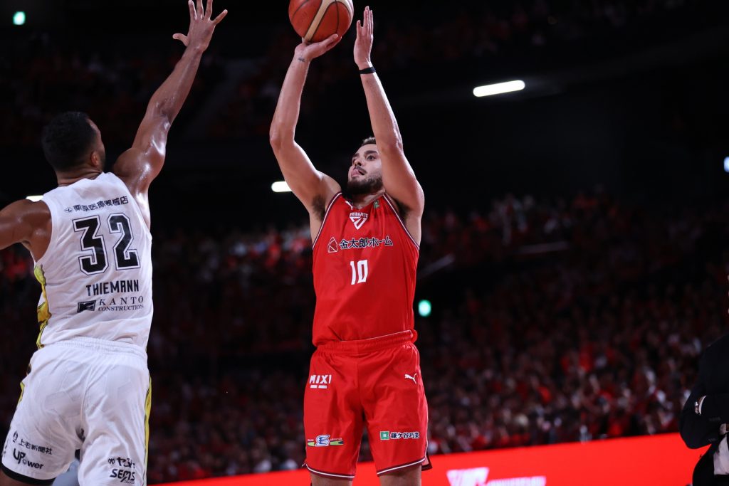 Chiba Jets forward DJ Hogg shoots a jumper in a game against the Gunma Crane Thunders on October 18 in Funabashi, Chiba Prefecture. (©B.LEAGUE)