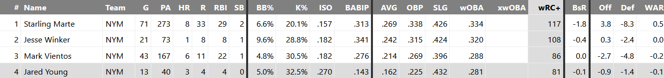 Starling Marte got the lion’s share of the work and was actually pretty good, although a 117 wRC+ from the DH spot would put the Mets 12th in Major League Baseball, tied with the Los Angeles Angels — so not bad, but also probably a little less than what you want there, considering there is little supplemental value from the position other than base running.