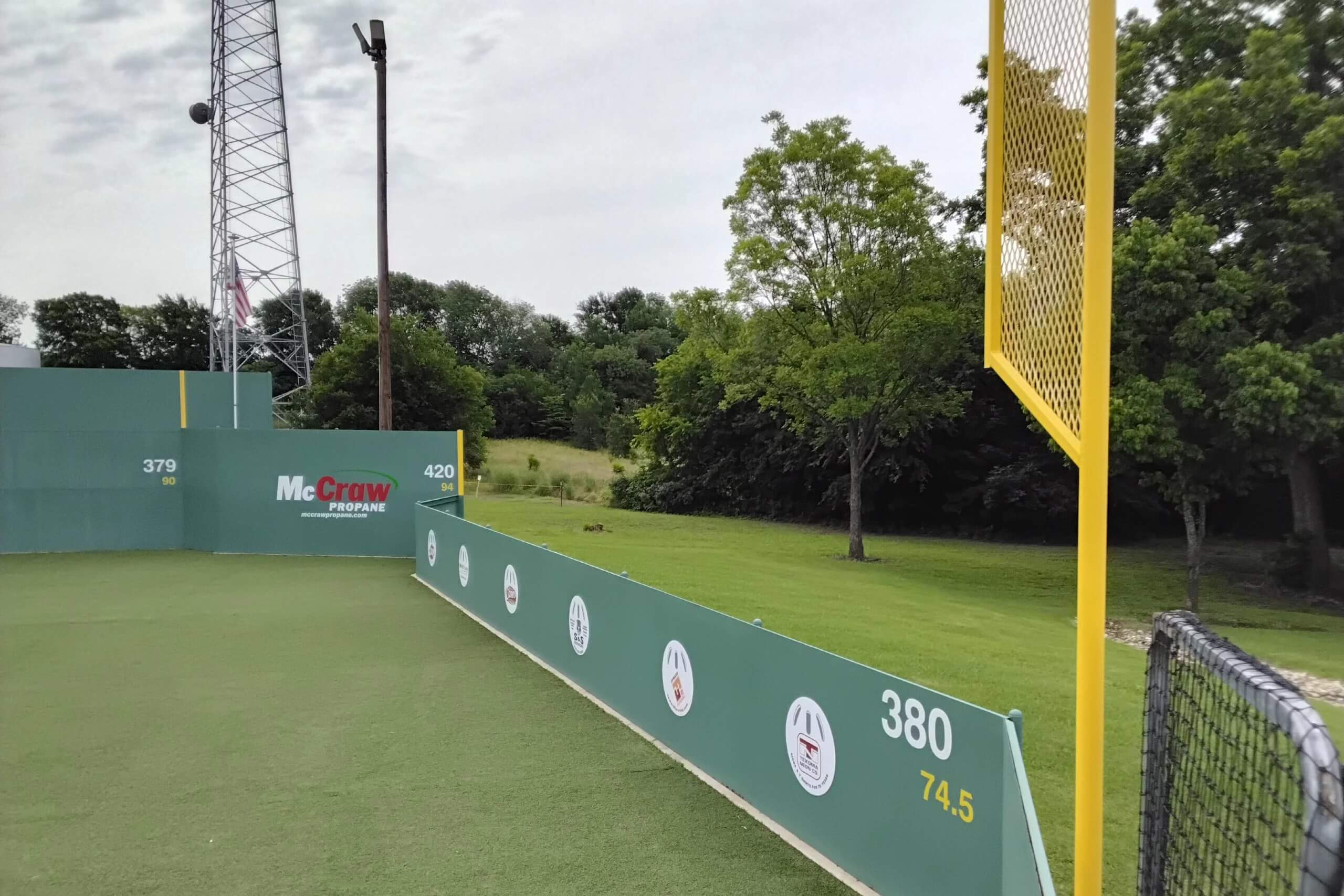The replica features two sets of numbers on the outfield walls. The white number represents the actual dimensions at Fenway. The yellow number represents the dimensions of the Bells field.
