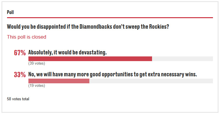 It all looked so bright last Friday, when the Diamondbacks had easily won their first game against the Rockies, 8-0. People might have had a thought about my drama poll and the option that it would be devastating if we were to lose even just one game against the worst team in the MLB. I think that after Saturday’s dramatic loss, the first one in franchise history while scoring 12 runs, some people might not have been that truthful to their own mind and heart when they voted for the option “No, we will have many more good opportunities to get extra necessary wins”.