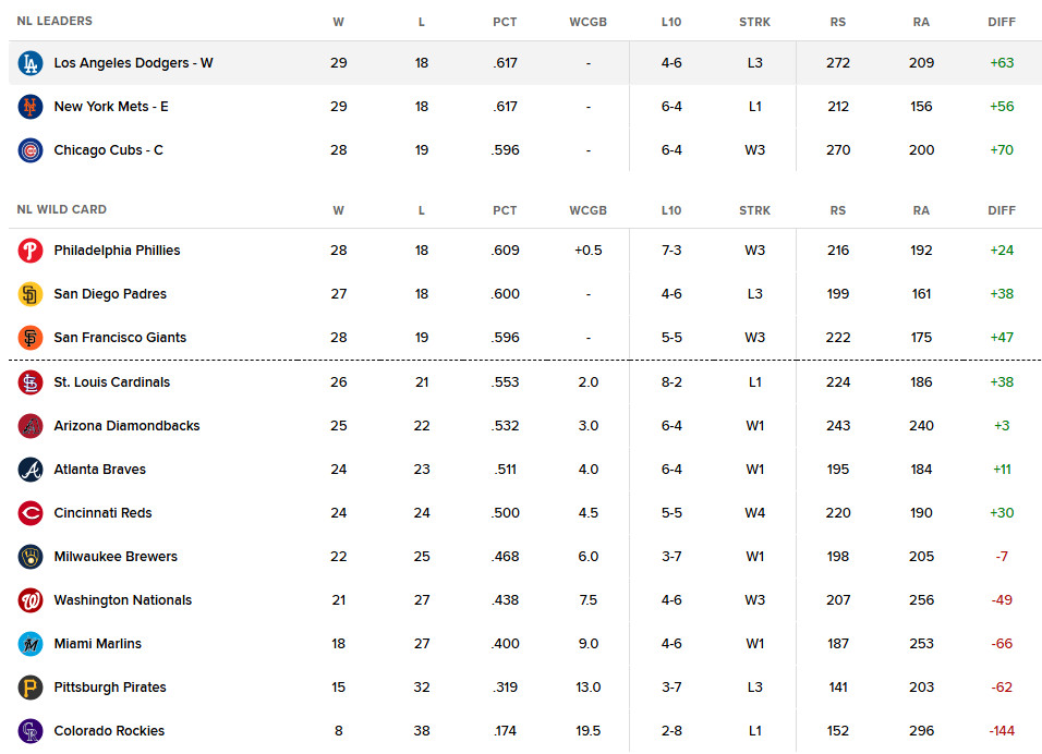 Obviously, the Dodgers are leading the NL West, but they are probably not as dominant as everyone thought they would be. They are not running away with the title (yet?) and after this weekend’s 3-0 loss against neighbour Los Angeles Angels, theoretically (according to baseball reference) they see themselves back in a wild card game (against the Phillies). That is probably what Dodgers’ fans want, considering they cried in the past over their team playing against teams in the playoffs that were able to warm up in the Wild Card playoffs, but it is probably not what they had envisioned at the beginning of the season. Padres and Giants are just one game behind the Dodgers in the NL West, the Diamondbacks are a bit further behind at 4.0.