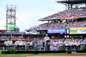 Aug 12, 2023; Philadelphia, Pennsylvania, USA; Former Philadelphia Phillies player Mike Schmidt gives a speech during a ceremony before the game against the Minnesota Twins at Citizens Bank Park. Mandatory Credit: Kyle Ross-USA TODAY Sports