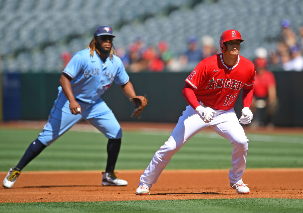 Home RunsAug 10, 2021; Anaheim, California, USA; Los Angeles Angels designated hitter Shohei Ohtani (17) takes a lead off first as Toronto Blue Jays first baseman Vladimir Guerrero Jr. (27) plays behind in during the first inning at Angel Stadium. Credit: Jayne Kamin-Oncea-USA TODAY Sports