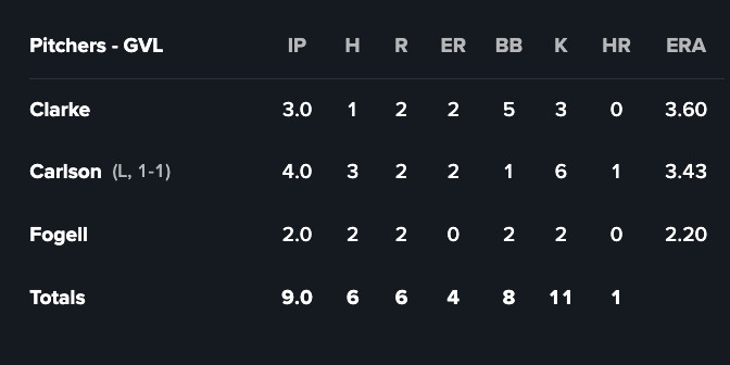 Franklin Arias hit a two-out, bases loaded single to score two and pull Greenville ahead 3-2. Sadly, that was just the second inning of this one against the Spartanburgers (Rangers High-A) and there was a lot of game left to play. In a game that saw the usually dependable Max Carlson and Brandon Clarke issue six walks between them, the offense also didn’t live up to their end of the bargain, leaving ten aboard.
