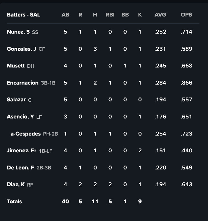 18-year old Justin Gonzalez ends his second week in A-ball with his second consecutive 3-hit game, none more important to score the go-ahead run in extra innings against the RiverDogs (Rays A). Freili Encarnacion would also drive in another run to make the game 5-3. This game may not have even been close had Salem mustered more than one base on balls Sunday evening, but we can’t look a gift horse in the mouth.