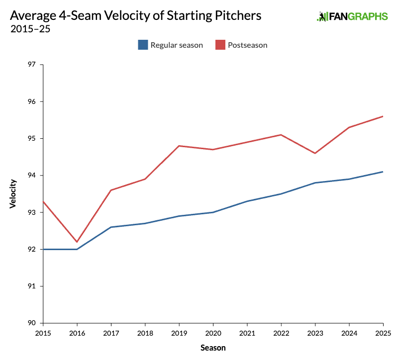 The scale is distorted in order to highlight the gap, but it’s still been pretty consistent. During this postseason, starters are averaging 95.6 mph with their four-seamers, up 1.5 mph from the regular season. The gap was actually at its largest in 2019 (1.8 mph) and smallest in ’16, though it closed to just 0.8 mph in ’23; other than that year, it’s been 1.2 mph or higher annually since 2018.