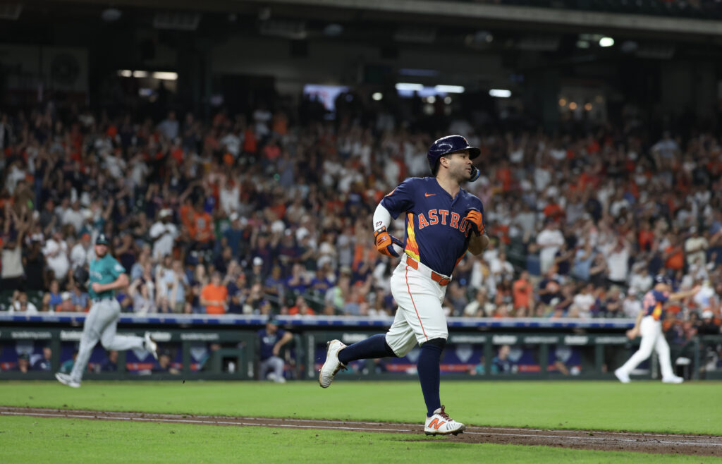 Jose Altuve – 27 HRsSep 21, 2025; Houston, Texas, USA; Houston Astros second baseman Jose Altuve (27) hits an RBI single against the Seattle Mariners in the seventh inning at Daikin Park. Mandatory Credit: Thomas Shea-Imagn Images