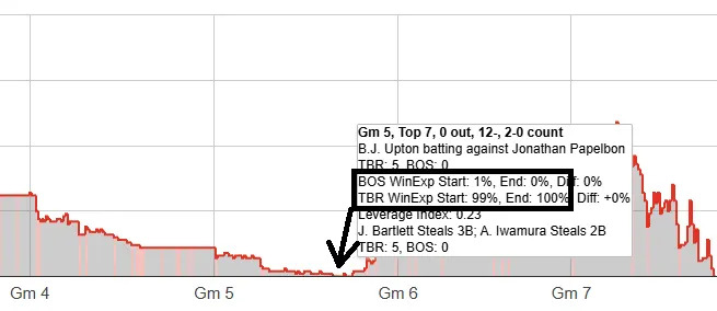 The Red Sox were down so far in this game, their series win expectancy was actually well below what it ever reached in the 2004 ALCS. For more detail, we can look at the win probability graph for the series on Baseball Reference, and there’s actually a point where the Red Sox win probability rounds to ZERO PERCENT in the top of the seventh inning (from 0.3 percent).
