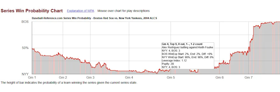 Compare this to the 2004 ALCS where the series win probability (based purely on mathematics) bottomed out at around two percent: