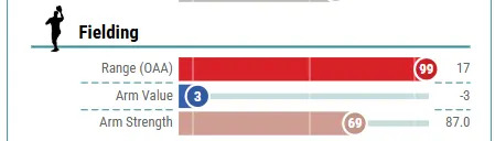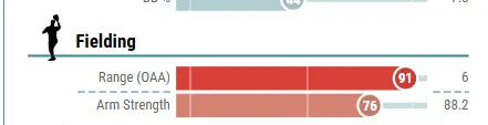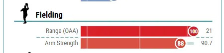 Really, though, that climb was more about being consistent enough to get enough innings to accumulate OAA. His somewhat low +3 in 2024 would have been undoubtedly much higher if he had been in CF (in St. Louis) more often that year. Again, his defense really wasn’t that surprising. How fast he found his level maybe was, but not the skill level. What is with that whole arm value thing? Is that really about the length of his arms (the reach?). Can someone explain that one to me? Now if he could only hit at an average rate…