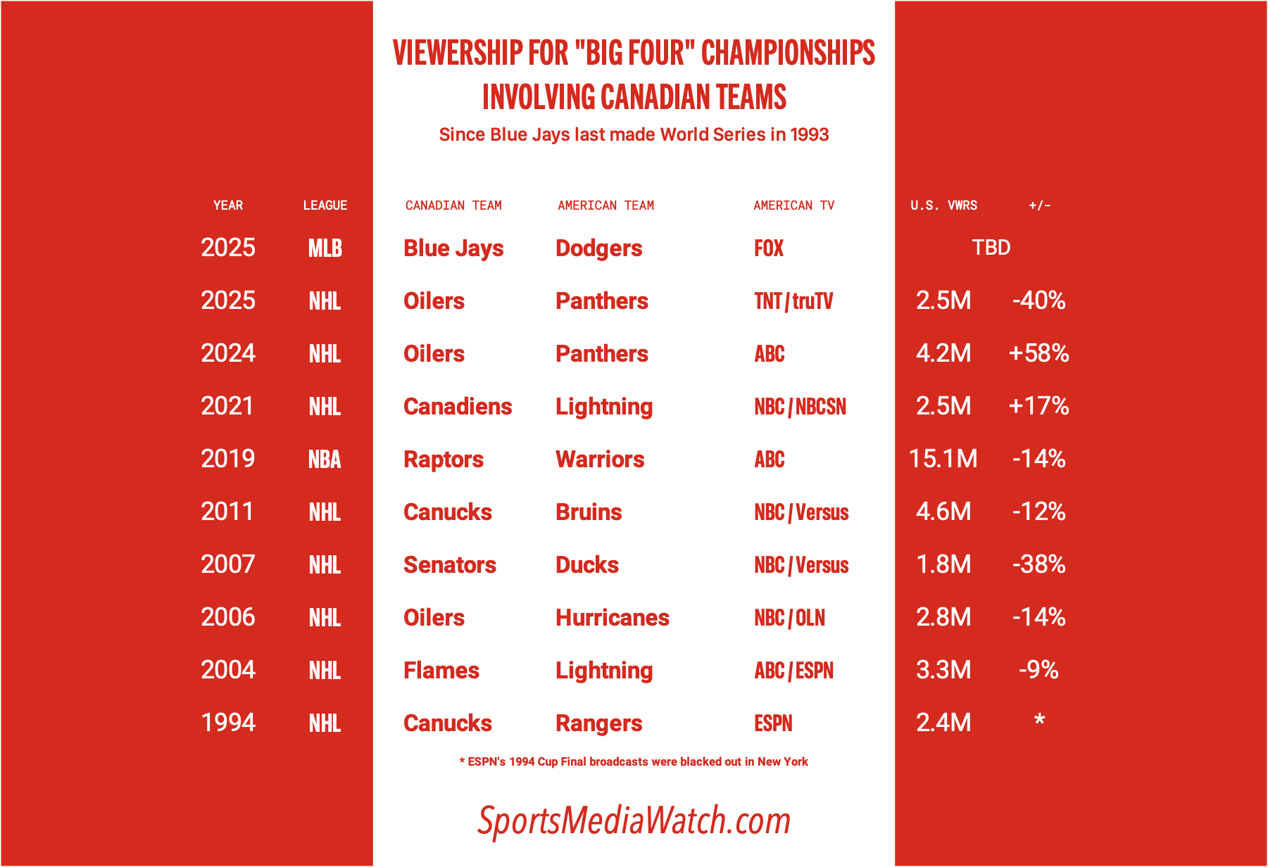 But because last year’s World Series set such a high bar, a decline in line with prior Canadian series would result in what is a strong viewership number by modern standards. A decline of 9-14% would put viewership in the 13 to nearly 14 million range, which would surpass each World Series from 2020-23 and put the 2018 and 2019 editions in reach.