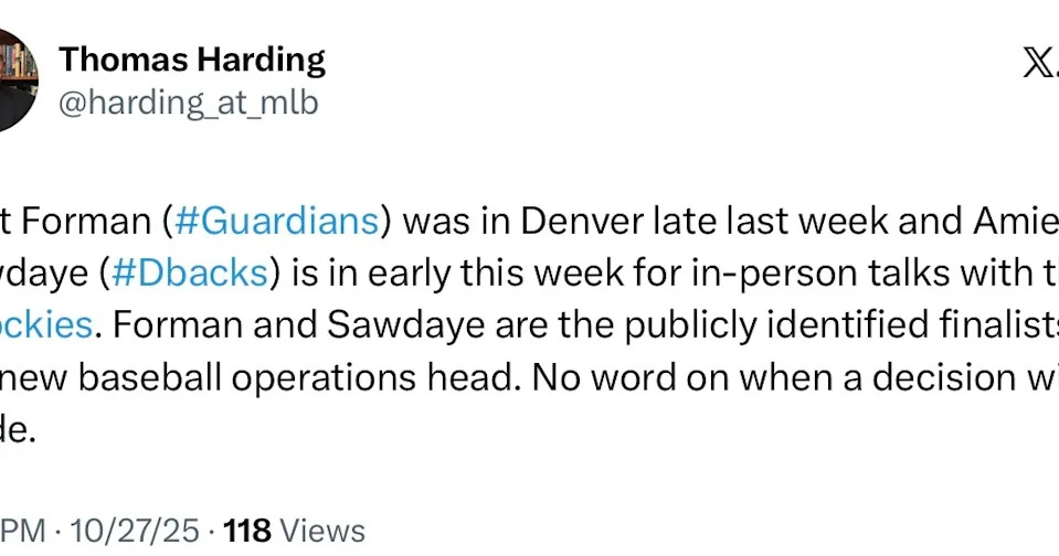 The Colorado Rockies have begun to pare down their list for their next head of baseball operations, with Arizona’s Amiel Sawdaye and Cleveland’s Matt Forman two of the finalists for the job, league sources told The Athletic on Wednesday.
