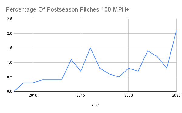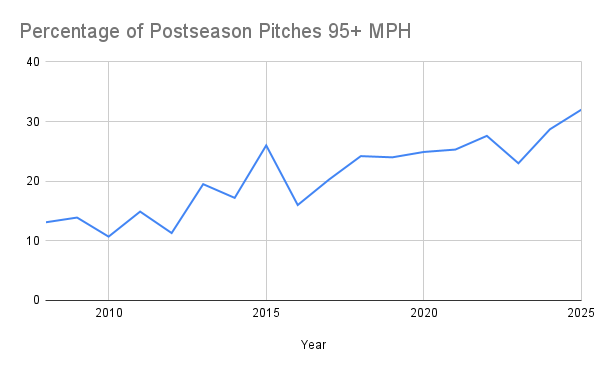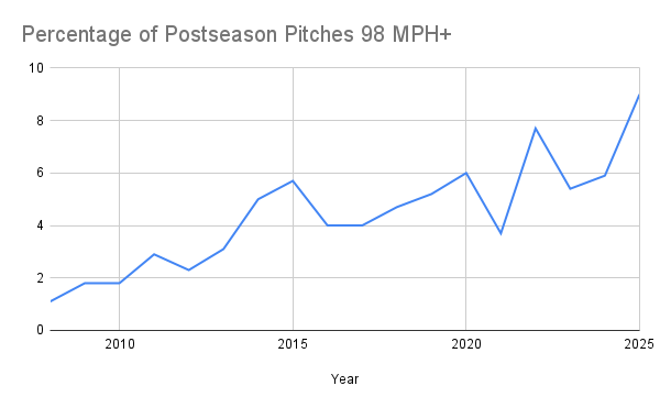 Sí, los datos de seguimiento de lanzamientos sólo se remontan a 2008. Pero teniendo en cuenta las tendencias, podemos afirmar sin temor a equivocarnos que nunca antes ha habido una postemporada con una velocidad tan alta como la que estamos viendo en 2025.