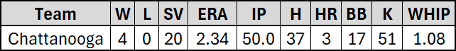 Over the final two months there was one week in there where Trevor Kuncl had some struggles. He would give up two runs in an inning of work against Montgomery (but still picked up the save) and then six days later allowed three runs in an inning against Biloxi (in a Lookouts win). In the other 16.0 innings he threw in August and September he gave up just three earned runs.