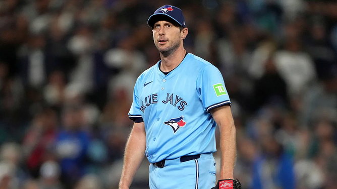 Toronto Blue Jays pitcher Max Scherzer looks to his dugout during the sixth inning in Game 4 of baseball’s American League Championship Series against the Seattle Mariners in Seattle, Washington, on Oct. 16, 2025. (Lindsey Wasson/AP Photo)