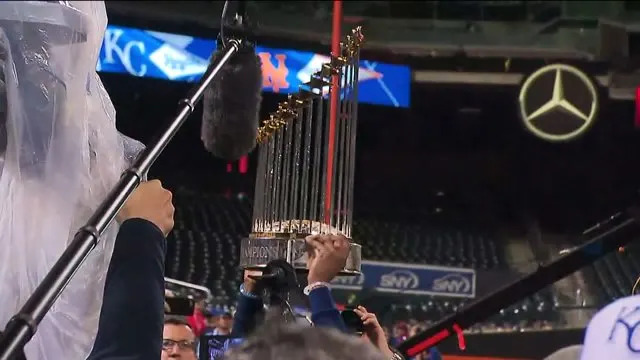 NEW YORK, NY – NOVEMBER 01: Salvador Perez #13 of the Kansas City Royals celebrates with the World Series Most Valuable Player Award after defeating the New York Mets to win Game Five of the 2015 World Series at Citi Field on November 1, 2015 in the Flushing neighborhood of the Queens borough of New York City. The Kansas City Royals defeated the New York Mets with a score of 7 to 2 to win the World Series. (Photo by Sean M. Haffey/Getty Images)