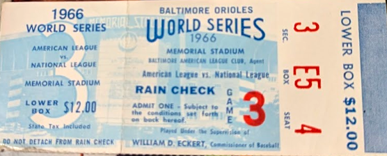 Ticket prices for World Series games this year were nuts, with reports from Los Angeles of box seats going for the resale price of $30,000. Cheap seats for last night’s Game 7 at the Rogers Centre in Toronto started at around $1,500, with a resale value of $2,400, according to The Athletic. For Game 6 on Friday night, a lower box seat started at $1,200 — or 100 times what a similar seat cost for Game 3 at Memorial Stadium in Baltimore in 1966.