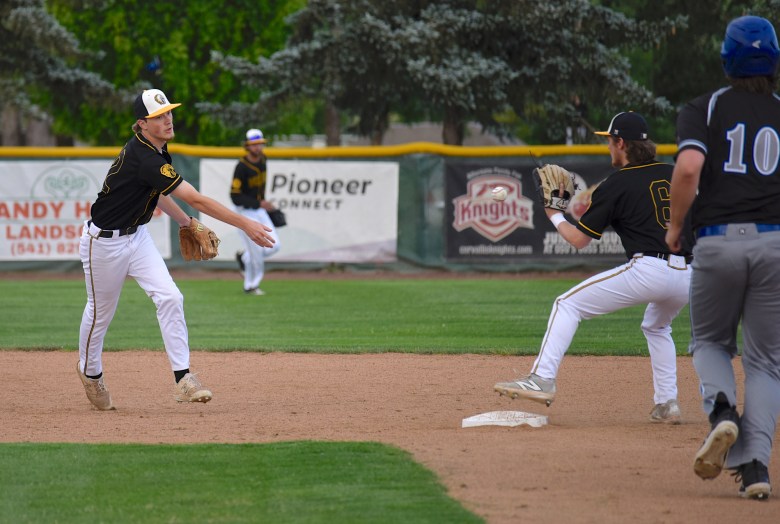 Warriors senior shortstop Kayson Olsen flips the ball to junior second baseman Wylie Griffith for a force out. (Photo by Andy Cripe/Philomath News)