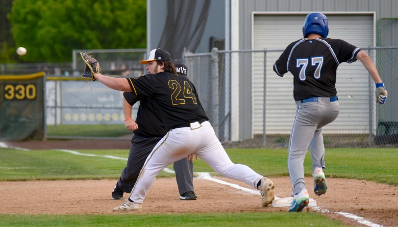PHS senior Brady Russell makes a catch at first base for an out. (Photo by Andy Cripe/Philomath News)