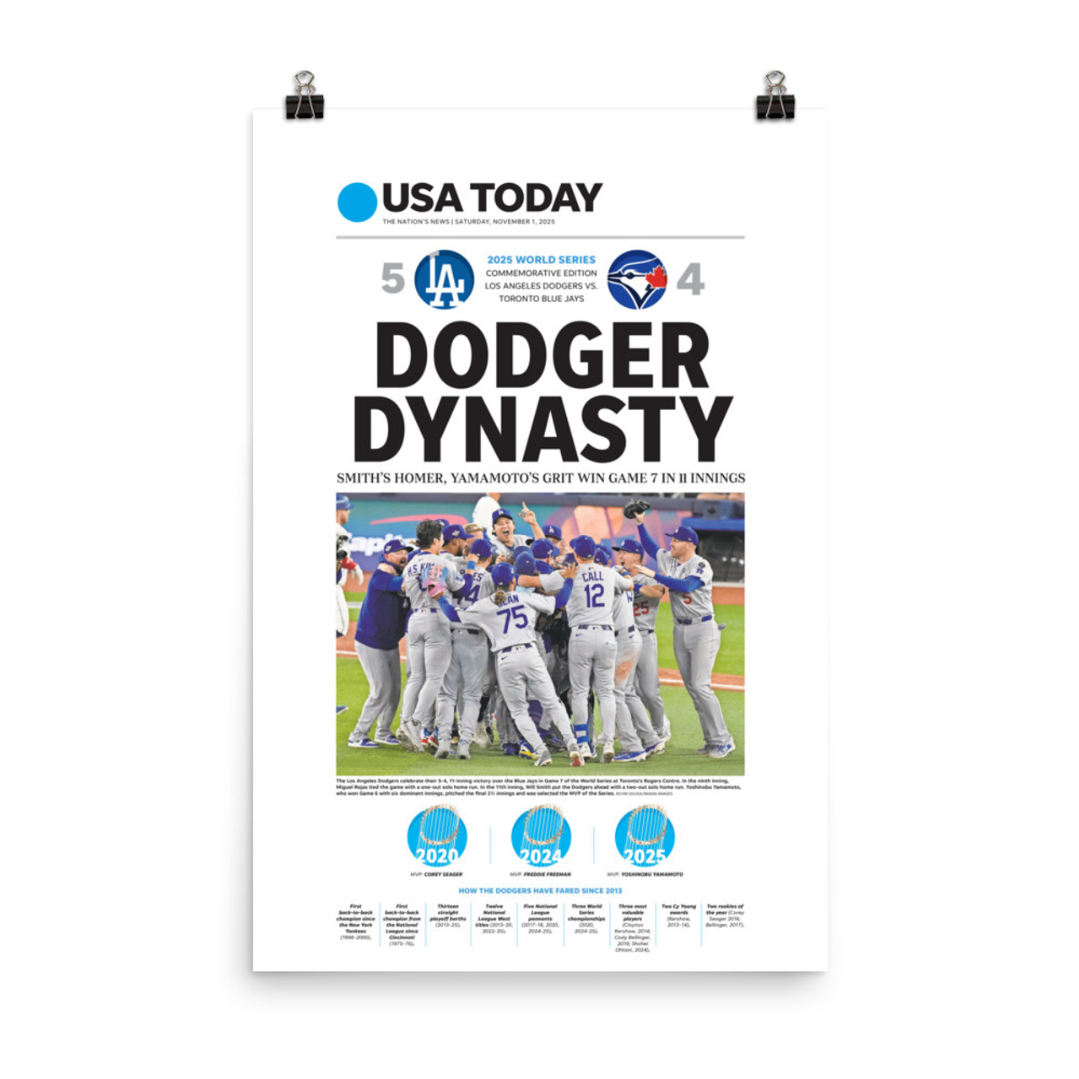 To celebrate the Dodgers as back-to-back World Series champs, get the team’s commemorative page prints for 2025 and 2024 from the USA TODAY store below: