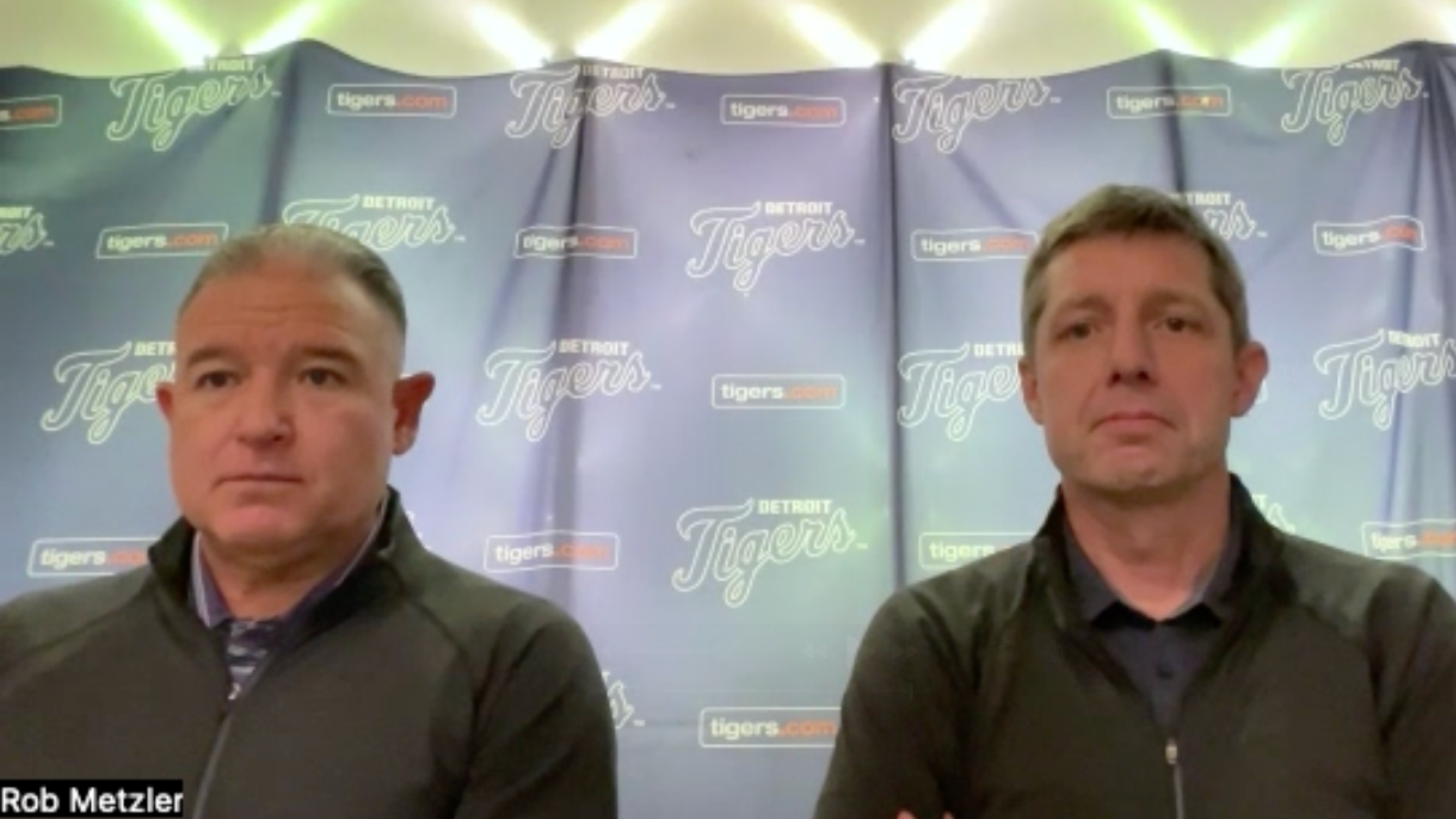 Detroit Tigers executives Miguel Garcia and Rob Metzler talk to reporters January 15, 2025, about signing top international prospect Cris Rodriguez.