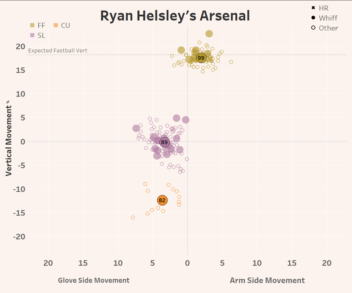 Pitching is a literal game of inches. Helsley’s 99 mph fastball has elite velocity, but it sits right below the expected vertical ride given his arm slot. If he upped the spin efficiency of the pitch from 89% to 95%, this suddenly becomes one of the deadliest fastballs in the game.