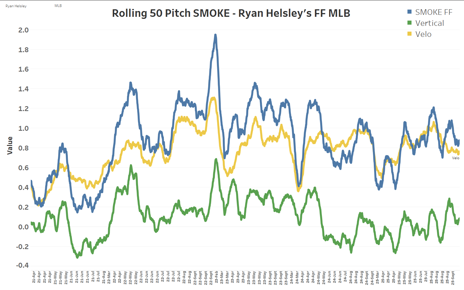 Fastball quality is relatively straightforward to measure. There are two primary components that determine fastball quality: velocity and how much ride the pitch gets compared to a pitcher’s arm slot. The green line indicates how much value Helsley has gotten on his fastball from the shape of the pitch. It was consistently above average from 2022 to early 2024, but he’s mostly been relying on velocity since then.