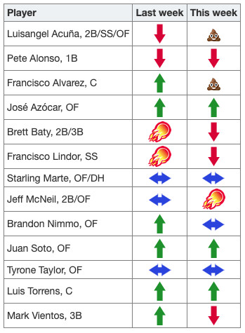 Unfortunately the other green arrows here are mostly players who aren’t taking a lot of at-bats. José Azocar barely plays and gets a green arrow just because he reached base once via a walk in his two plate appearances this week. And the backup catcher Luis Torrens hit two singles and walked twice in his eight plate appearances this week. Francisco Alvarez, by contrast, went hitless in 15 plate appearances this week, which earns him poop emoji status. Alvarez did walk three times and score a run this week, but he has not looked great with the bat since returning from his hamate injury, which may still be affecting him.
