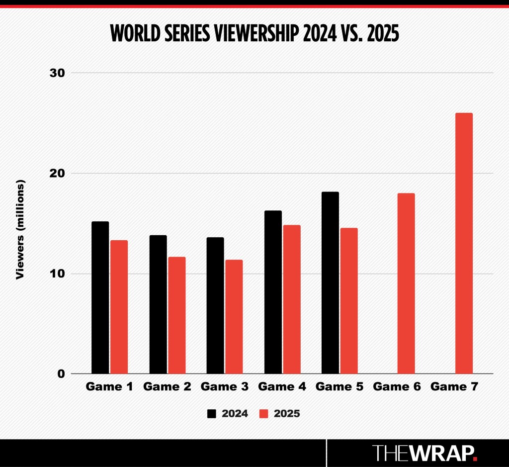For Game 5, the 2025 Series scored 14.57 million viewers, down 19.7% from last year’s Game 5, which ended the Series. The 2025 matchup saw its biggest viewership yet with Games 6, which scored nearly 18 million views, and finished big with 25.98 million views for the finale Game 7.