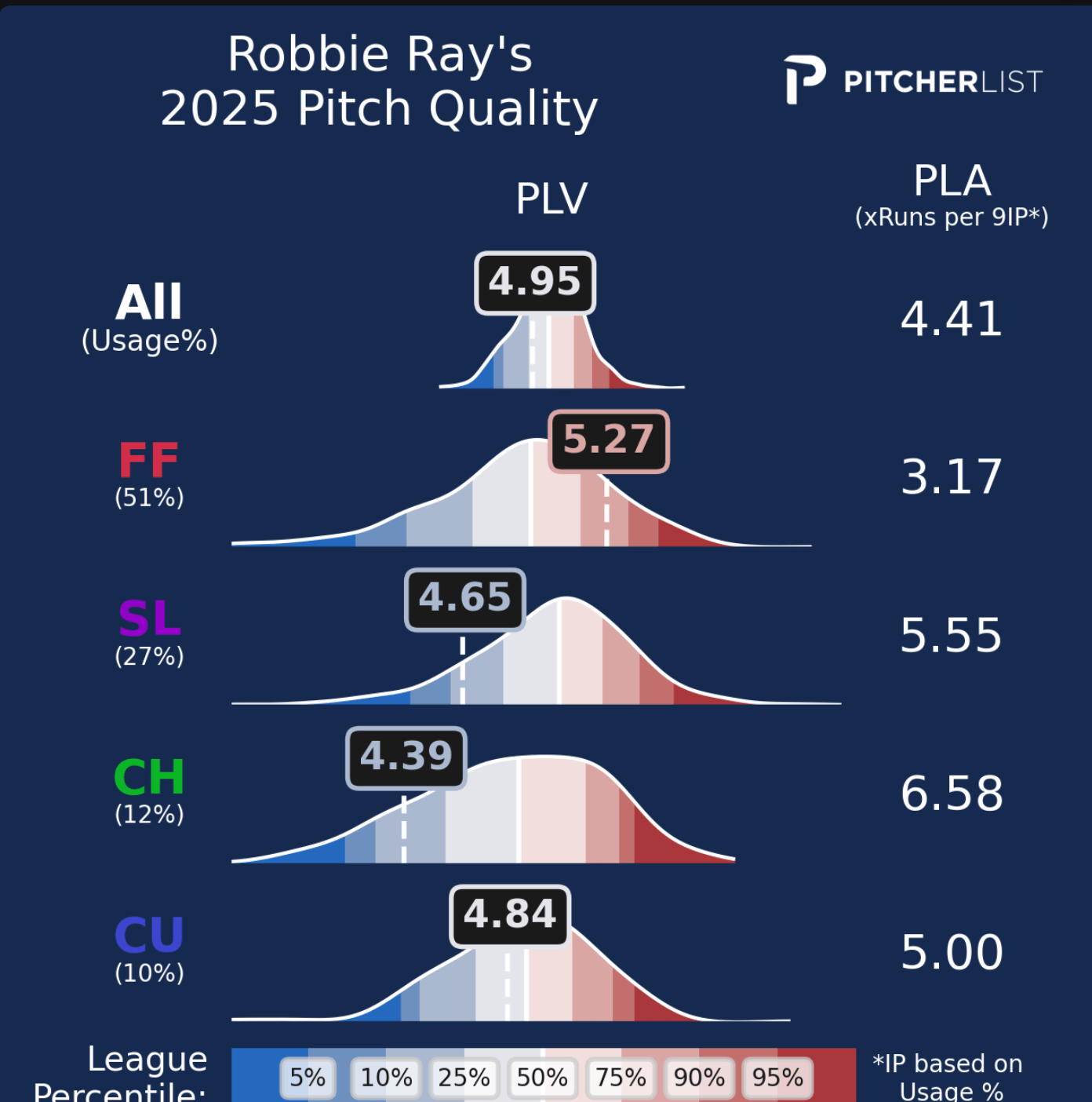 PLA projects Ray as a fairly middling pitcher, which dispels the notions of him either being an elite-of-the-elite guy or a bottom-of-the-barrel pitcher. PLV likes his fastball, but gives a below-average grade to all of his secondaries. The new Tarik Skubal-inspired changeup, in particular, has been rough, as Ray continues to struggle to locate the pitch.