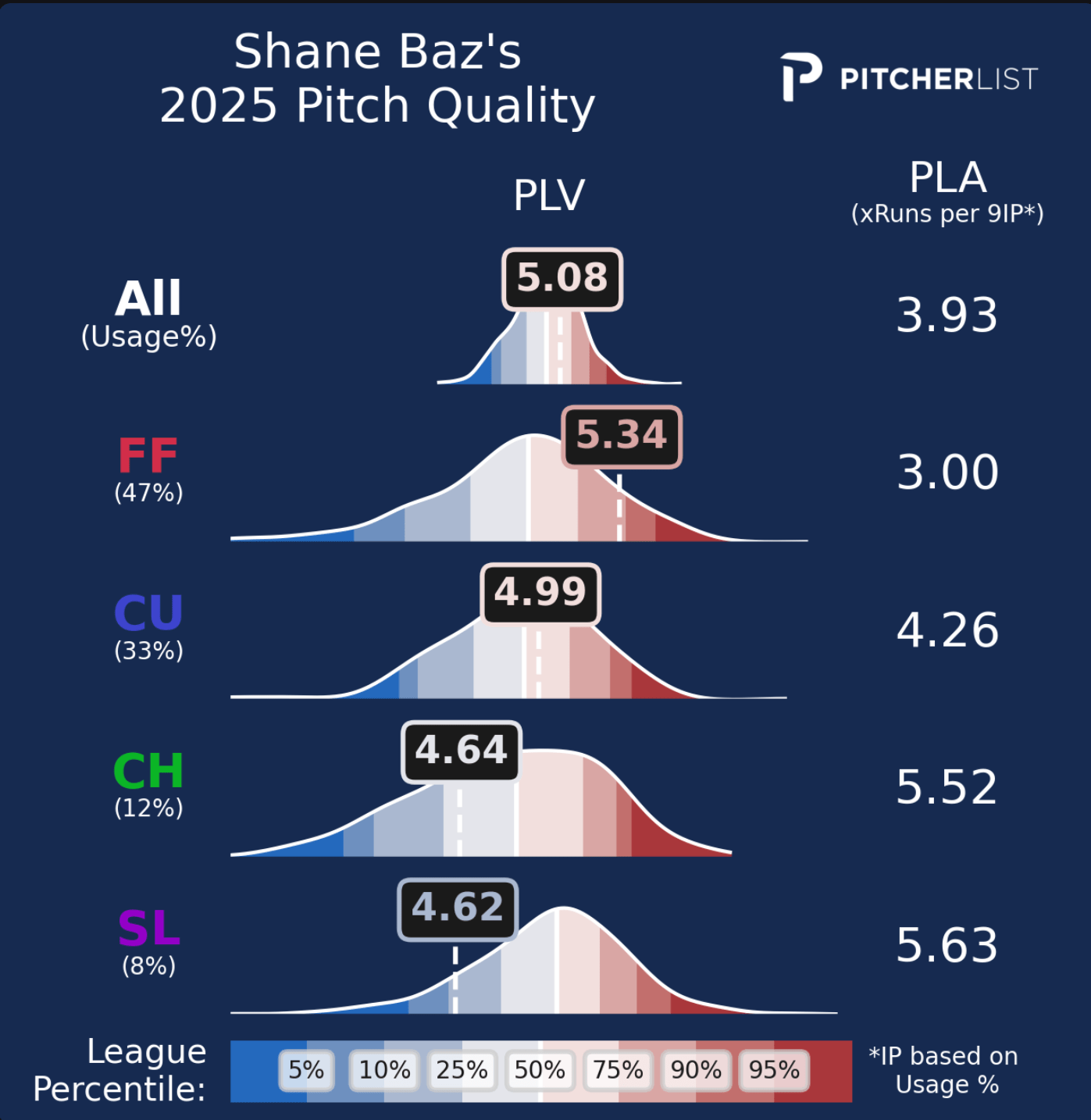 The problem for Baz this year? The slider. He was known to have a “destroyer of worlds” slider in the minors, as it got whiffs at an elite rate and paired well with one of the best fastballs of any prospect. Unfortunately, after returning from Tommy John surgery, Baz hasn’t seen much success with the pitch, as he hangs it routinely, which is why he’s had these blowup starts. The rest of his arsenal has looked awesome, as the four-seamer still has solid shape and great velocity, while the curveball has shown flashes of being one of the best in the Majors. Unfortunately, some recent starts have led to the curveball’s PLV readings going down significantly, as he has had some starts where he hasn’t known where the pitch was going upon it leaving his hands.