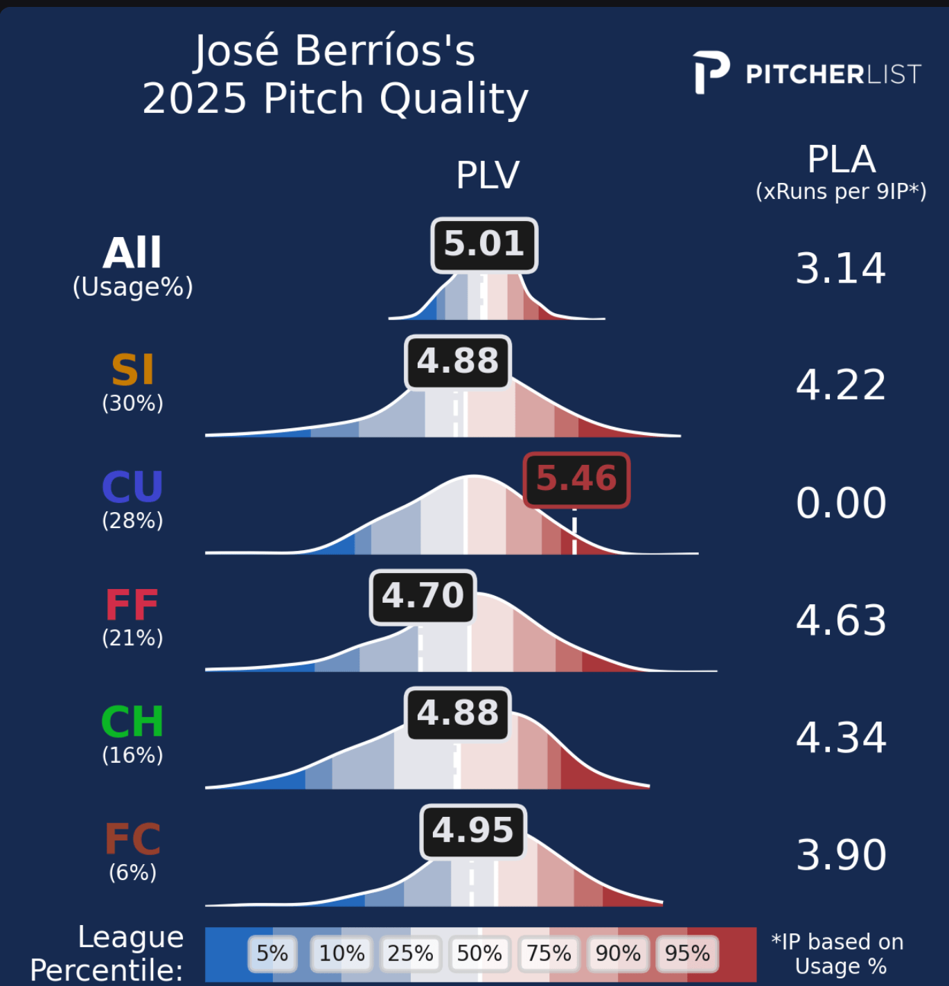 Interestingly enough, most of Berrios’ five-pitch arsenal grades out rather poorly by PLV. The key to his success? That classic, GIF-able curveball that was his primary offering once upon a time. This pitch has incredible PLV numbers, some of the very best of any curveball. This is interesting, as none of his result-based rate stats on the pitch are particularly elite. This could perhaps be attributed to the way the pitch plays with the rest of his arsenal or just bad luck. Either way, this pitch is a PLV outlier, which is the reason why PLA loves Berrios.