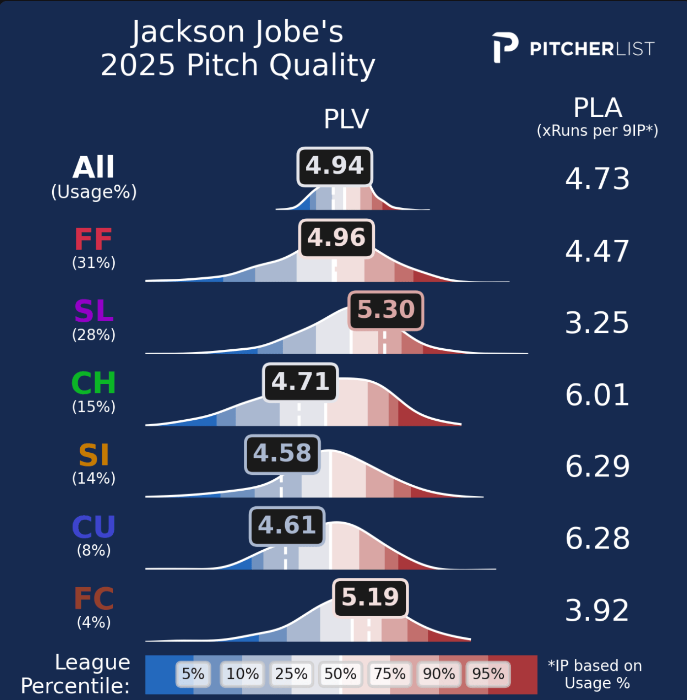 Jobe has a pretty deep arsenal, though none of the pitches have quite stood out like he’d hoped. His four-seam fastball, while great in terms of shape and velocity, has taken a hit in the PLV column due to his inability to locate it. His zone rate is awful compared to many other four-seamers, which has led to putrid strike rates and a lack of swings on the pitch in general. PLV likes his slider a ton, though it lacks the swing-and-miss of other offerings with a similar grade. The change, sinker, and curve are all well below average in terms of PLV, which contributes to his inflated PLA.