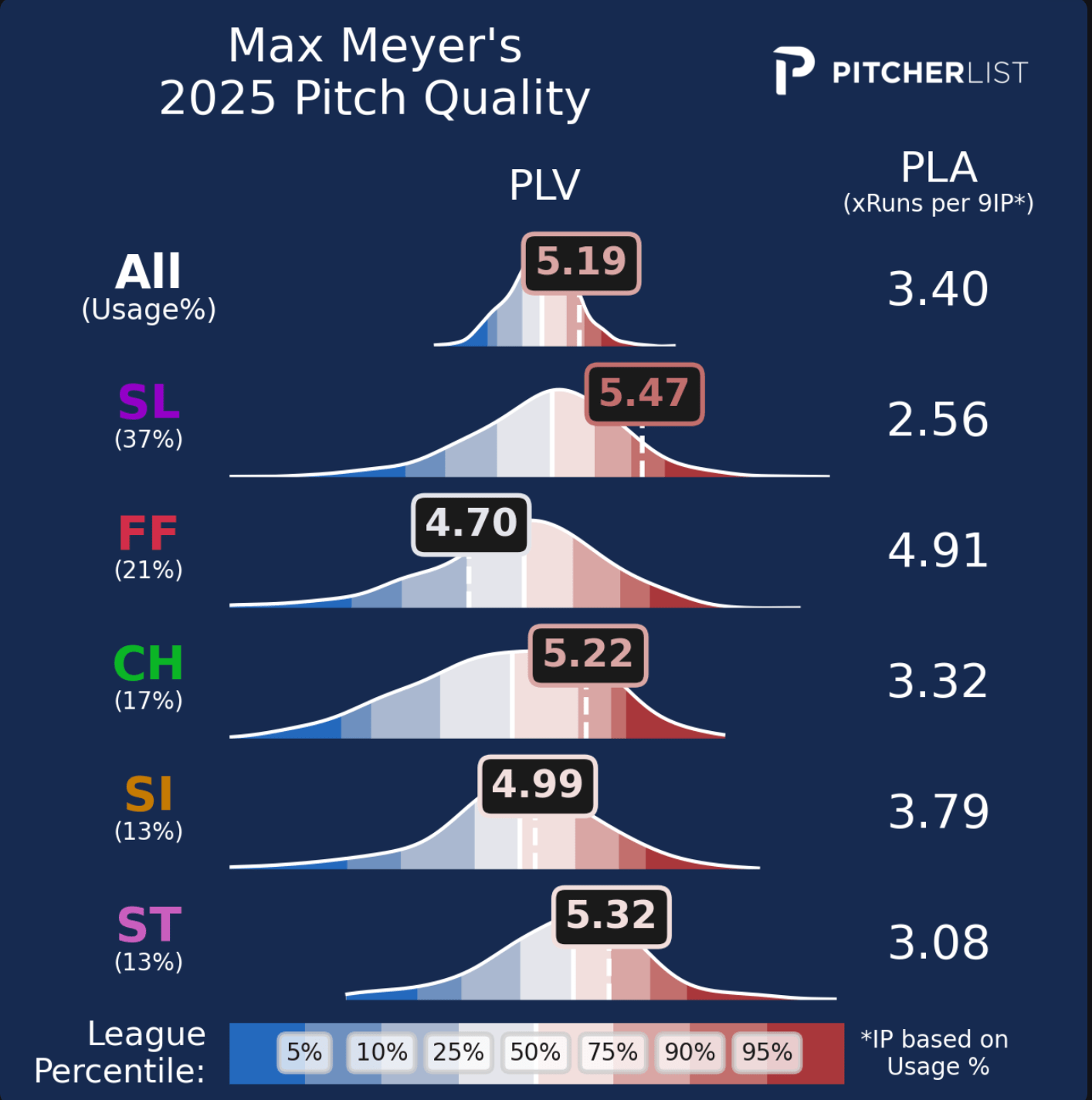 With that said, there is plenty to be optimistic about with Meyer. If you look at PLA, you will quickly realize that he’s in a better spot than many of these other cherry bomb/HIPSTER-type arms, though many who apply other stats would probably disagree. Meyer’s PLA is bolstered by his slider, which PLV loves. It’s a 90mph offering that gets tons of swinging strikes, so much so that it is his primary pitch. On the flip side, his four-seam fastball has not been pretty, as it has one of the worst PLV marks of any heater from a relevant pitcher, especially one who has pumped 95/96 in some of his outings.