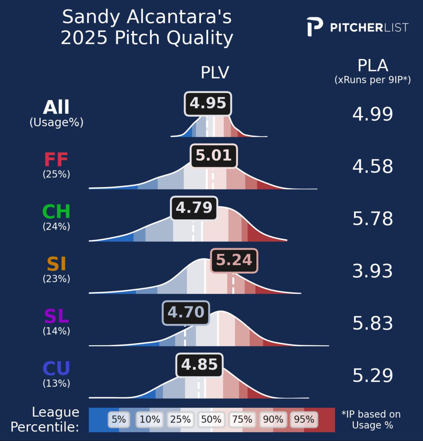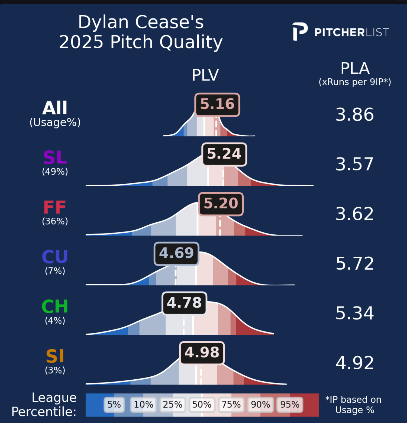The reality is, Cease’s ceiling will never make him a drop-worthy arm. PLA shows this, though his numbers portray more of an SP3/4 type for your roster rather than your first guy off the board. Part of the issue for Cease is the fact that he is essentially a two-pitch guy, as his slider and four-seam fastball are elite, but his changeup/curveball/sinker are barely used for a reason. As long as he struggles to make anything out of these pitches, his PLA will probably sit around the high 3/low 4 range, especially with his command that can be brutal against lefties.
