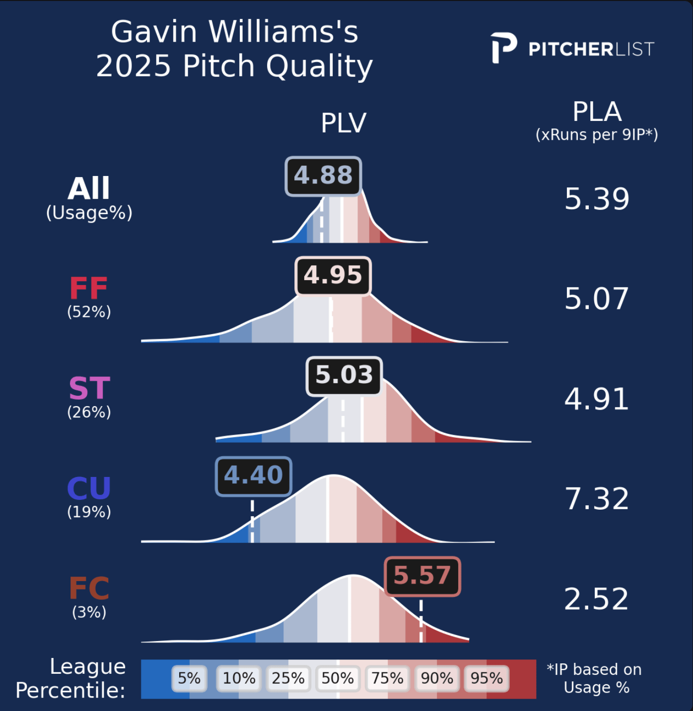 It was difficult to find Gavin Williams on the PLA leaderboard, as unfortunately, one has to scroll down far to find him. This really sucks, as Williams really looked to be one of the true breakout candidates of the year. This can still happen, as it’s early in the season, but Williams has been hard to watch at points, and PLA would agree.