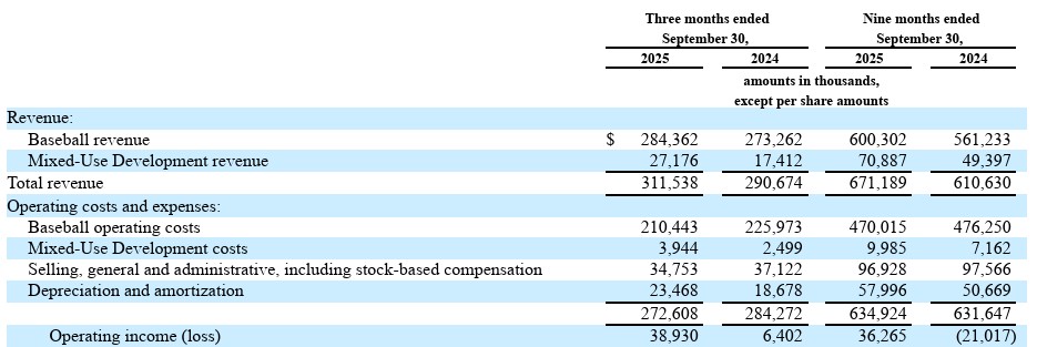 Total revenue grew to $312 million in the third quarter of 2025, up 7% from the prior year period.Baseball revenue increased 4% from the prior year period to $284 million.Mixed-Use Development revenue grew 56% from the prior year period to $27 million.Total Adjusted OIBDA(1) grew to $67 million in the third quarter, up 114% from the prior year period.Baseball Adjusted OIBDA grew 105% from the prior year period to $50 million.Mixed-Use Development Adjusted OIBDA grew 62% from the prior year period to $20 million.