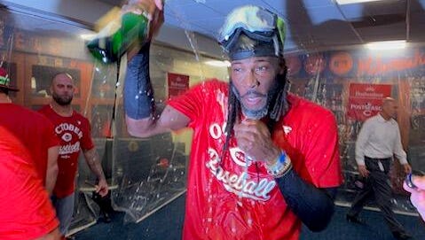 Elly De La Cruz and Reds teammates during clubhouse celebration