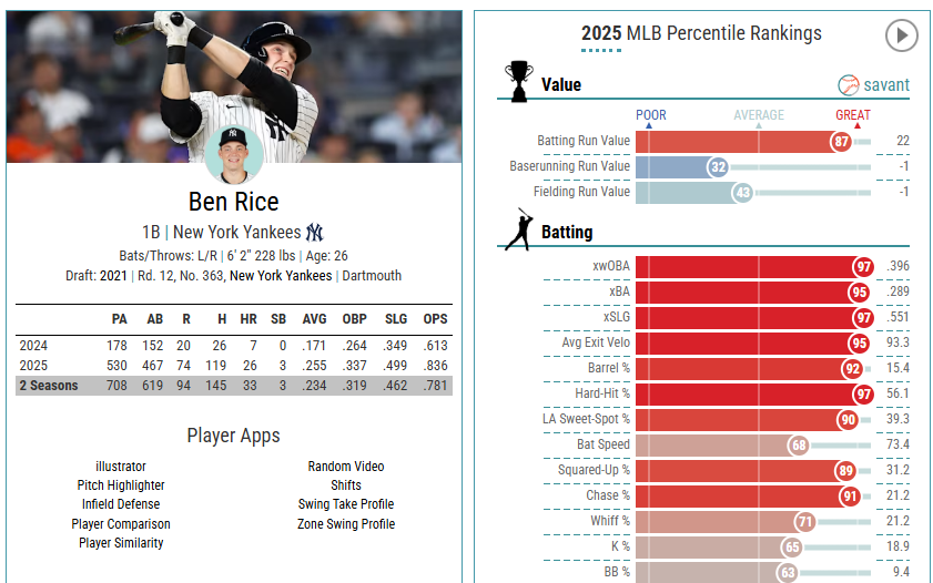 For the Fish, this trade would address their ongoing need for offensive help in the infield corners. This past season, Rice broke out in a big way, hitting 26 HR and posting a .836 OPS. When you look at the expected numbers, it even suggests that he was somehow UNLUCKY during his season-long offensive surge. Rice improved in every metric hitting wise, also along with increasing his bat speed, which correlates with added power potential. Not to mention, he could play catcher in a pinch in case of emergency. He isn’t arbitration eligible till 2028, and isn’t a free-agent till 2031, so Rice would definitely be here for the long-term.